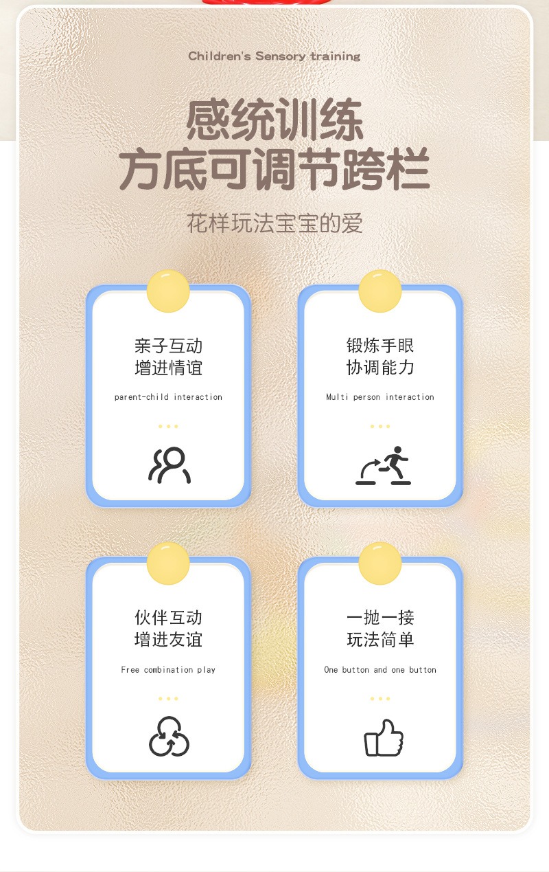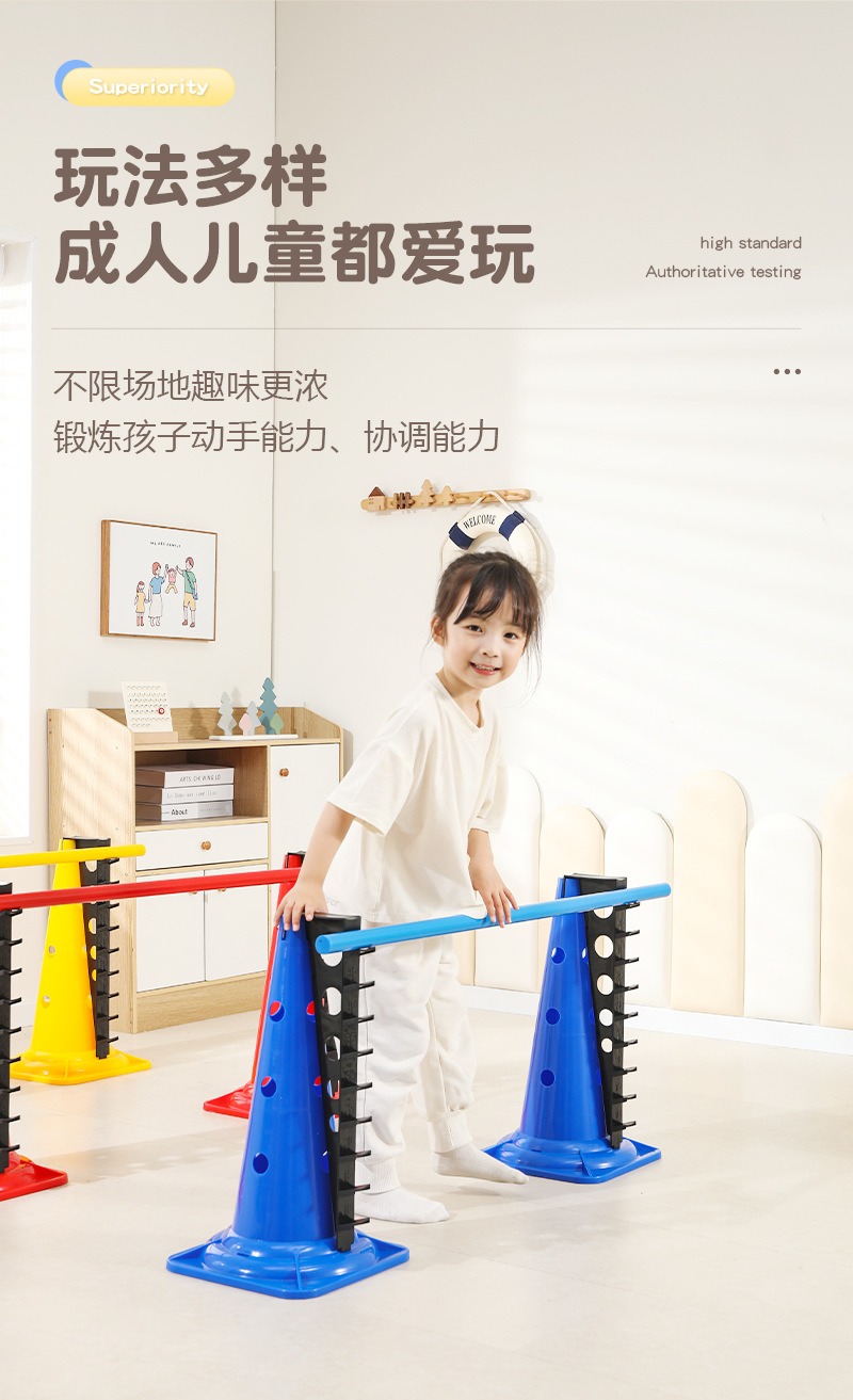 1.「高度自由调节,难度循序渐进」 我们独创的卡扣式调节器,让横杆高度的设置变得前所未有的简单。从蹒跚学步的低障碍,到活力四射的高抬腿跨越,可根据不同年龄段孩子的身高与运动水平,轻松设定从10cm到50cm的多种高度,让训练挑战与孩子的成长同步,科学保护,避免运动损伤。