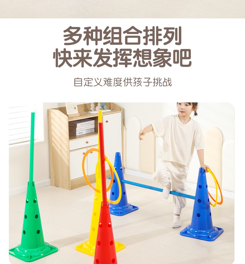 —————— 【一“桶”多用,解锁无限玩法】 告别单一功能的玩具,我们这套器材是名副其实的“变形金刚”。通过标志桶、横杆与调节器的简单组合,即可搭建出无穷无尽的训练场景,激发孩子的想象力与创造力: