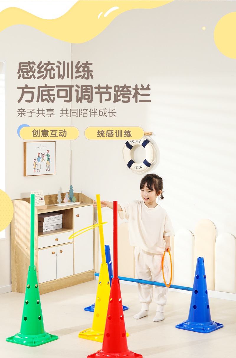 2.「全能感统训练,促进身心发展」 这不仅仅是一套运动器材,更是一套专业的感统训练工具。在跨、跳、钻、绕的动态游戏中,能够有效刺激孩子的前庭觉、本体觉和视觉发育,全面提升: