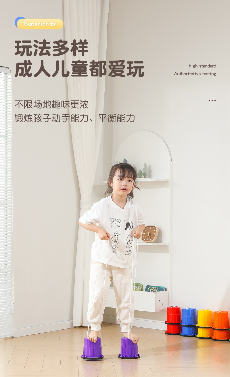- ③ 科学尺寸,舒适体验 经过大量儿童身形数据分析,我们设计出12cm的科学高度,既能带来适度的挑战乐趣,又确保了孩子的安全感。可调节长度的加粗棉绳,手感舒适,可根据不同身高年龄的儿童自由调节,陪伴孩子一同“长高”。