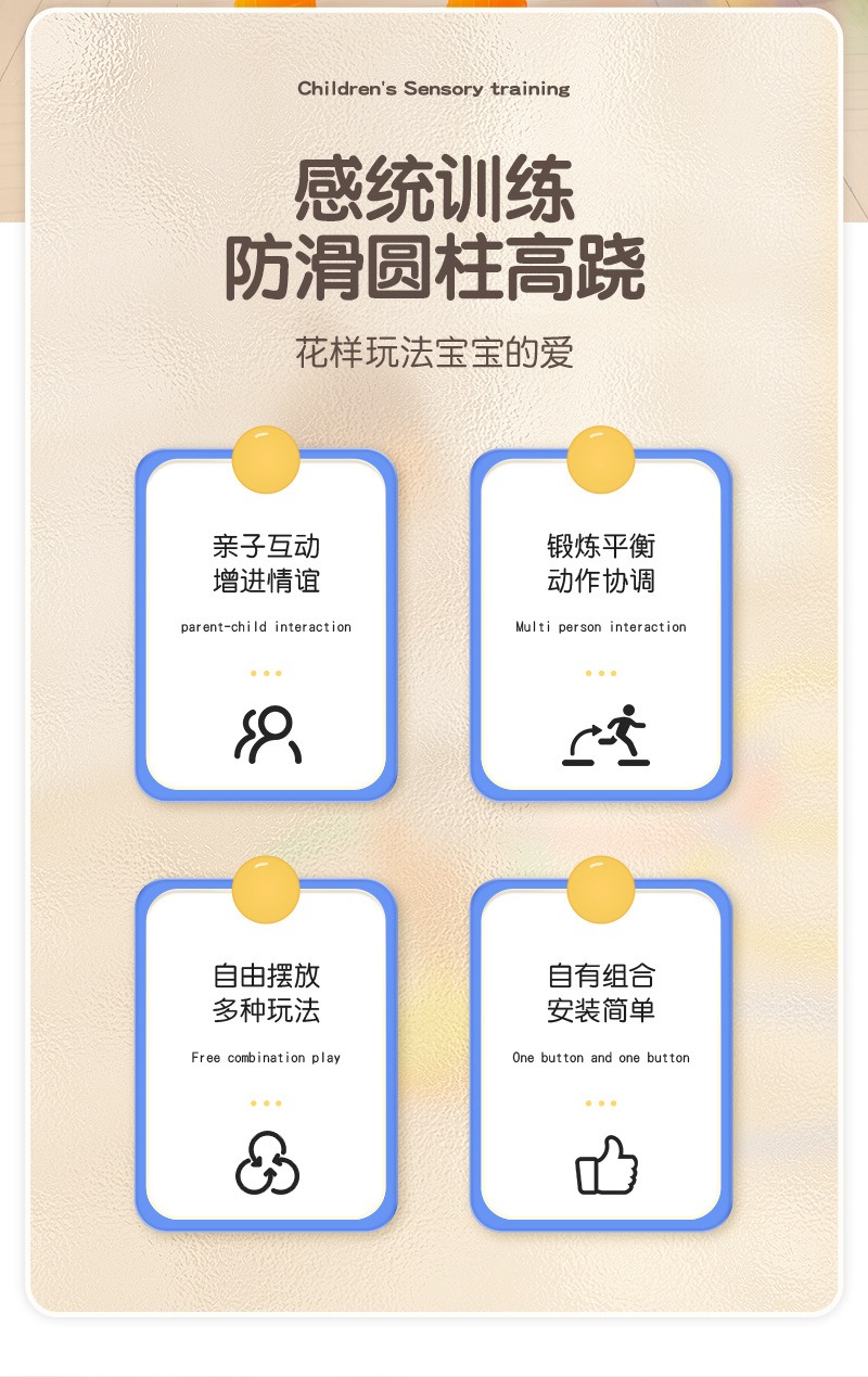 - ② 双重防滑设计,稳固加倍 安全,我们考虑得更多!高跷顶部踩踏面特别设计了防滑纹理,增大摩擦力,防止脚底打滑。底部更嵌入了一整圈高品质防滑橡胶垫,能牢牢抓住木地板、瓷砖等多种光滑地面,有效防止侧滑倾倒,为孩子的每一次挑战保驾护航。