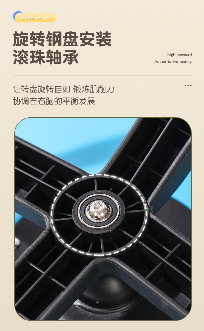▶ 工业级滚珠轴承,顺滑无声 核心转盘采用加厚金属与精密滚珠轴承结构,转动如丝般顺滑,安静无噪音,承重力强,确保经久耐用,即使成人也可安坐。