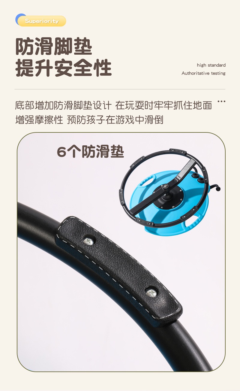 ▶ 加厚稳固底座,稳如磐石 底座采用坚固的金属材质与科学的三角力学结构设计,重心低,抓地牢。底部更贴心设有6个防滑脚垫,有效防止侧翻和位移,保护地板的同时,更给予孩子双重安全保障。