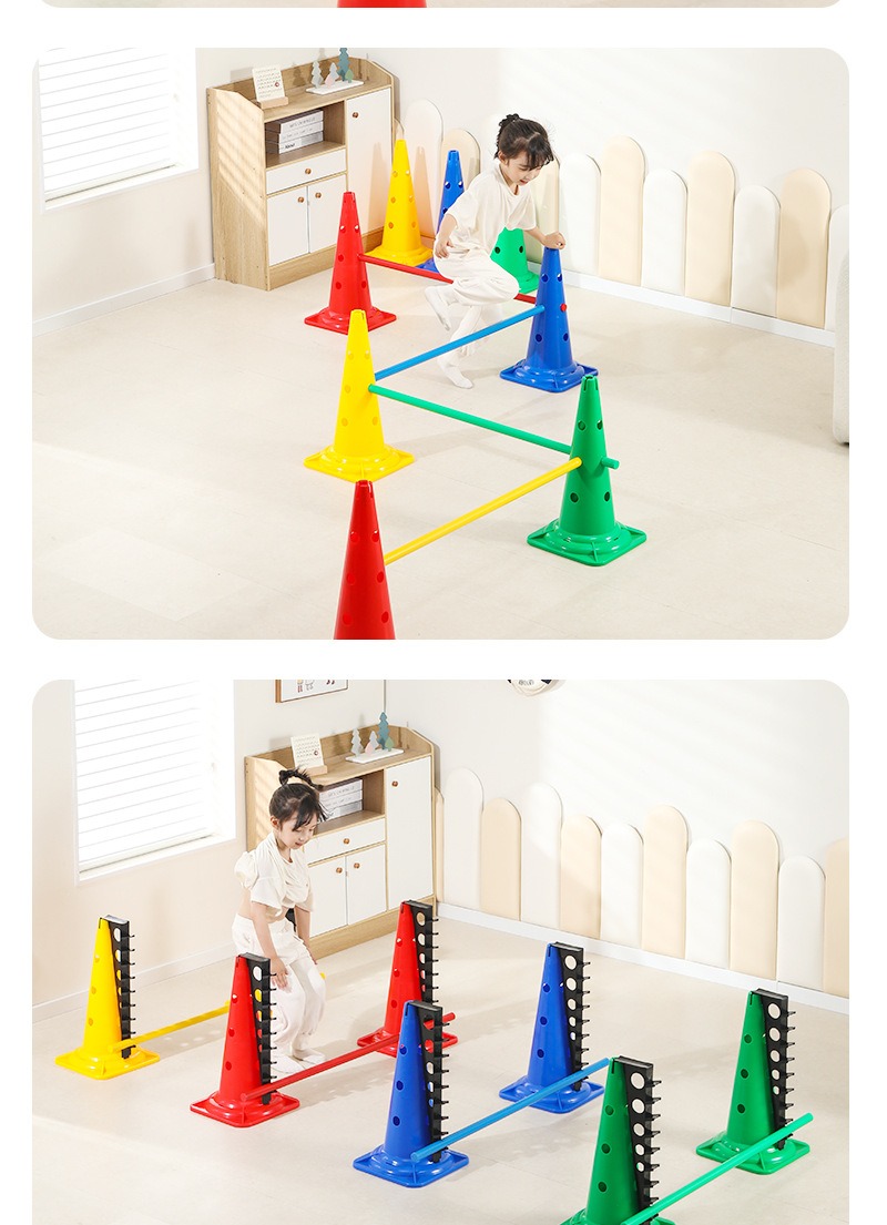 —————— 【一“桶”多用,解锁无限玩法】 告别单一功能的玩具,我们这套器材是名副其实的“变形金刚”。通过标志桶、横杆与调节器的简单组合,即可搭建出无穷无尽的训练场景,激发孩子的想象力与创造力: